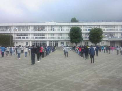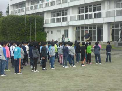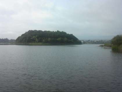 朝礼の様子です。ひんやりとした爽やかな空気の中、ウグイスなどの野鳥のさえずりを聞きながら会は進みます。写真右は、宿舎前の湖畔から見た鵜島です。