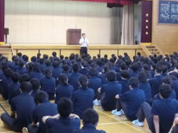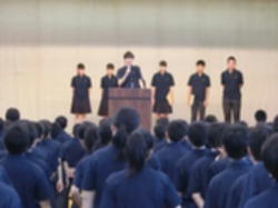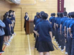 本日行った生徒会朝礼では、先週の金曜日に行われた委員会、中央委員会の内容について、代表生徒から話がありました。朝礼後、校長から自分の大切さとともに他の人の大切さを認めることやことばの大切さについての話などや、安全指導の担当から、地震への対応や熱中症予防を例にした活動中の安全についての話がありました。集中して話を聴く生徒たちの姿がありました。