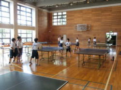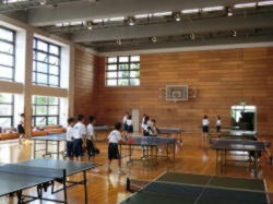体育館でバレーボール部が基本的な練習に取り組みます(写真 左)。卓球部は、各自の内容に沿った練習に協力して取り組みます(写真 中、右)。