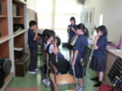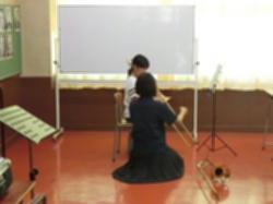 吹奏楽部に受け入れた児童の皆さんに、楽器ごとに分かれて教える本校生徒の様子です。どの部活動でも丁寧に教える生徒たちの姿があります。本校の生徒にとっても、教えることを通して学ぶよい機会です。この体験を通じて学び舎の子どもたちの交流が深まることを期待します。引率を受けていただいた小学校の先生方にも感謝いたします。