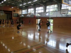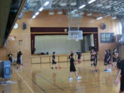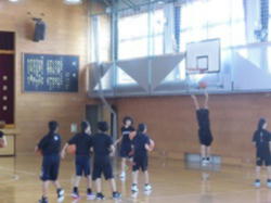 シュート練習に取り組むバスケットボール部の様子です。明日、部活動体験の受け入れを行います。