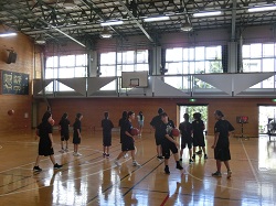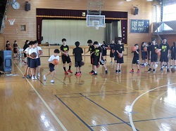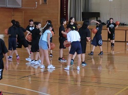 本校生徒と一緒にシュート練習に取り組むバスケットボール部の体験の様子です。待っている間に、コミュニケーションを図ります。