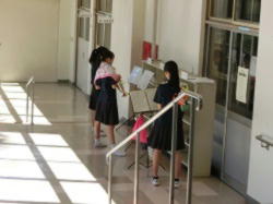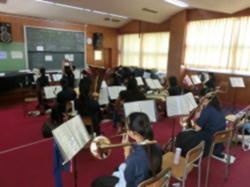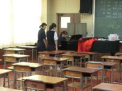 第一音楽室と廊下で練習に取り組む吹奏楽部です(写真 左、中)。28日に開催される区音楽発表会に出演します。第二音楽室で合唱コンクールに向けてピアノの練習に取り組む様子です(写真 右)。