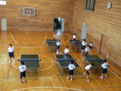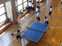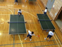 格技室で試合形式の練習に取り組む卓球部の様子です。どの部活動も体調管理に留意しながら練習を進めています。