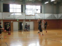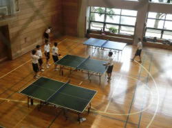 夏休みも終盤になりました。いくらか暑さが和らいだ今日、体育館でシュート練習に取り組むバスケットボール部男子と格技室で試合形式の練習に取り組む卓球部の様子です。