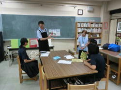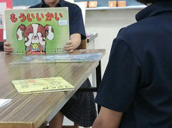図書室で行われた「読み聞かせ講座」の様子です。この取組は、図書館司書のご協力を得て、希望生徒を対象に行われます。読み聞かせに興味のある生徒をはじめ、職場体験で保育園や幼稚園などでお世話になる生徒たちが、園児たちに読み聞かせをするために事前の準備として自主的に参加します。