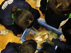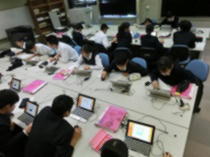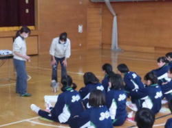 説明の後は、実際にタブレットを使用して講義の内容を確かめてみました(写真左)。体育館では、都立園芸高校動物科の先生による、園芸高校各科の授業内容や動物科についての説明をしていただき、高校生が普段世話をしているウサギや犬に触れ合わせていただく体験をしました(写真中、右)。中学校の授業では体験できない、高等学校の特色ある授業体験を通して、進路について考える機会をもつことができました。