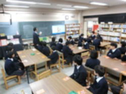 読書活動を推進する取組の一環として、司書による図書の紹介を朝の読書タイムを活用して実施しています。司書の方がお勧めの本について、分かりやすく説明していただきました。11月27日から29日が2年生の各クラス、12月4日から7日が1年生の各クラスを対象に行われます。