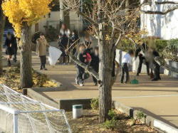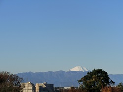 朝の寒さが厳しく強めの風が吹き、校舎から富士山の白い頂がはっきりと見える空気の澄んだ14日の朝、一年生がいつもより少し早めに登校します。中学校に入学してはじめての落ち葉掃き、気持ちの良い挨拶を交わしながら落ち葉を掃きます。
