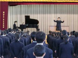 校長講話の後に校歌を斉唱しました。指揮者と伴奏者が2年生に引き継がれ、初めての指揮と伴奏を立派に果たしました。これからもお願いいたします。式後、生活指導担当からは3学期の生活について、また、安全指導担当からは登下校の安全についてなどの話がされました。3学期も一人ひとりがまた集団がよりよく成長するための取組を応援します。