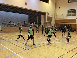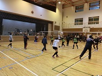 中町小学校体育館を会場に、第4ブロックに所属する中学校のPTAバレーボール大会が開催されています。本校のPTAバレーの皆さんが、準備運動をしっかりして試合に臨みます。