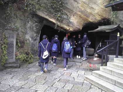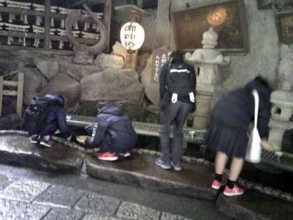 銭洗い弁天の様子です。お金をザルに入れて洗います。ご利益がありますように。雨が上がり、日がさしてきました。