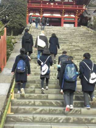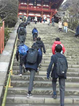 昼食をとった後、鶴丘八幡宮の階段を元気にのぼります。