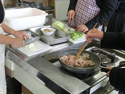 1年家庭科では、基礎的な日常食の調理ができるようになることを目標にして調理実習を行い、「しょうが焼き」をつくりました。班で協力して下準備や調理を同時進行で行います。手際のよさに感心します。おいしそうなにおいが廊下まで漂います。できあがったしょうが焼きを班ごとにおいしくいただきました。片付けも協力して行いました。