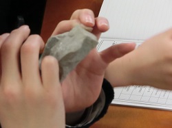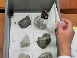 6種類の岩石をルーペでの観察や塩酸を使用しての反応をもとに、グループで意見を出し合いながら分類します。各班の結果を発表し、まとめが行われました。協力して意欲的に取り組む姿勢から、成長の一端をうかがうことができる授業の様子でした。