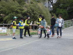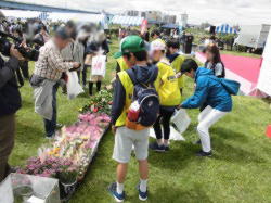 4月29日(月)、二子玉川花みず木フェスティバルに、生徒たちがボランティアとして参加しました。オープニング演奏終了後、黄色のビブスを着用し、草花チャリティーの苗木や鉢植えの配布、会場案内図の配布で活躍する生徒たちです。