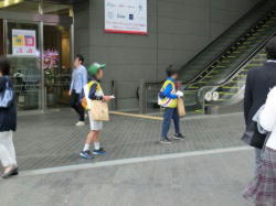 二子玉川駅前では、道路、公園での喫煙禁止を呼びかけるティッシュ配布を行いました。また、午後、吹奏楽部が演奏する機会をいただき、日頃の練習の成果を披露しました。会の最後に行われる抽選会でも、生徒たちが活躍しました。本校では、「心を育てるボランティア活動」を推進し、地域や学校運営委員会ボランティア支援部会のご協力のもと、生徒たちが地域の活動やボランティア活動に参加しやすい環境を整えています。黄色のビブスを着用した生徒たちがこれからも地域で活動します。
