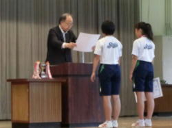 全校朝礼を行いました。5月1日に着任した「すまいるルーム」専門員の紹介とあいさつ、5月の人格の完成の標語「思いやり」に関連する校長講話、テニス部の表彰、安全指導担当からの交通事故や事故発生未然防止にかかわる話がされました。朝練習で見せた「動」の姿、朝礼に臨む「静」の姿から、中学生としてあるべき姿を強く感じることができました。
