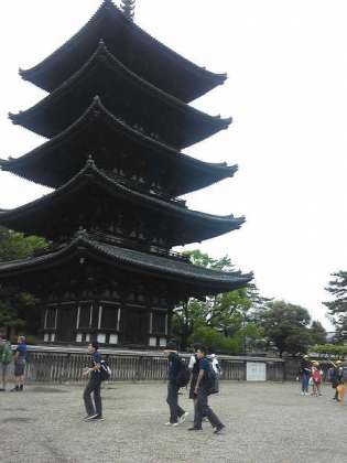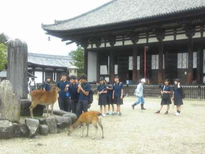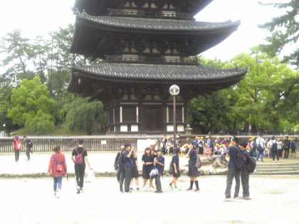 班行動も終了が近づきました。宿舎近くの興福寺の五重の塔、東金堂前の様子です。後半は天気も回復し、生徒たちはよくまとまって行動します。