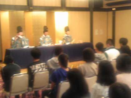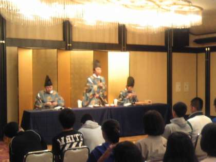 雅楽鑑賞教室が始まりました。はじめに、雅楽の歴史、しょう、龍笛(りゅうてき)、篳篥(ひちりき)の楽器の変遷などを話していただきました。