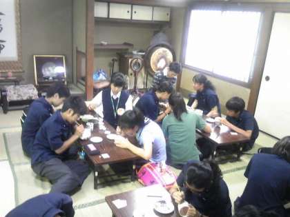 藤平陶芸で体験学習に取り組むグル−プです。丹念に図柄を描きます。予定の時間が気になりますが、集中して取り組みます。体験学習で作成したすべての作品のできあがりが楽しみです。