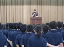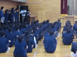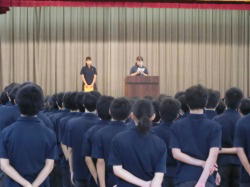 生徒会役員が進行役となり、会が進みました。体育館に入場した生徒たちは、所定の位置に座って開始を待ちます。今日は先週行われた委員会を受けて、1年学級委員会、図書委員会からは会員に向けての連絡事項が、選挙管理委員会委員長からは、来学期に行われる生徒会選挙の公示についての内容が伝えられました。最後に生徒会役員から、期末考査を終えてからの今後の学校生活についての話がされました。学校生活をよりよくしようとする自主的、積極的な取組をこれからも期待します。