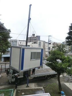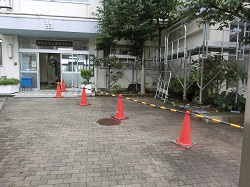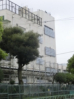 7月16日(火)〜10月1日(火)の日程で西校舎外壁改修工事と屋上防水改修工事が実施されます。昨日から準備が始まり2日目の様子です。北側の足場設置、事務所の設営などが安全に十分配慮しながら進められています。工事期間中、何かとご迷惑をおかけしますがご理解、ご協力をお願いいたします。
