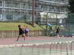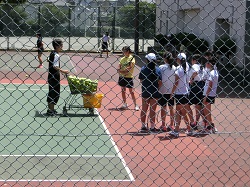 各部、適切に休憩を入れながら練習に取り組みます。テニスコートでは、テニス部が、1年と2年に分かれ、協力して練習に取り組みます。