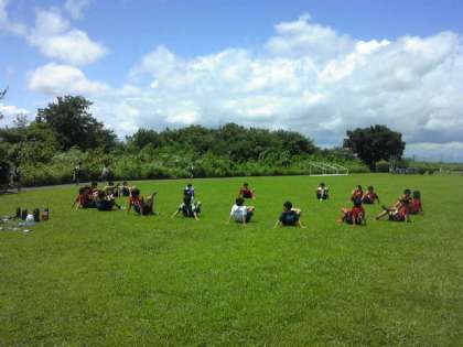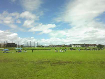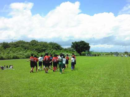 区民体育大会準々決勝の試合に向けて、準備にのぞむサッカー部です。強い風が暑さを和らげる中、生徒たちは元気に活動します。