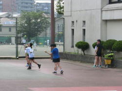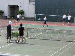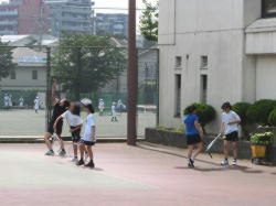 テニスコートでは、サービスの練習と基本的な打ち方の練習のグループに分かれて、テニス部女子が練習に取り組みます。上級生が下級生にアドバイスをしながら練習は進みます。