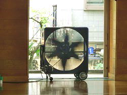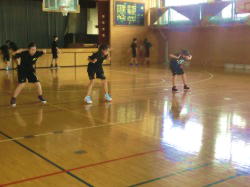 体育館では、バスケットボール部がフットワークの練習に取り組みます。地道な練習ですが、正確なステップを身に付けることが上達の近道です。生徒たちは真剣に取り組みます。体育館には、以前から配置されている大型扇風機が稼働中です。