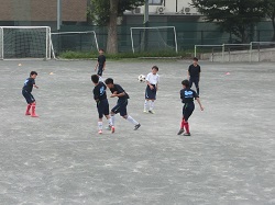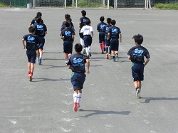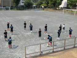 校庭で練習するサッカー部の様子です。途中で太陽が陰ったときは、幾分暑さが和らいだように感じましたが、こまめな水分補給と、練習の合間合間に短い休息をはさみながら練習に取り組みました。