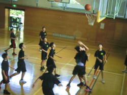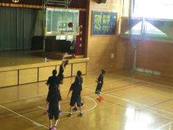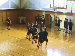バスケットボール部が、男女に分かれ、ハーフコートでのゲーム練習に臨みます。練習の合間に、水分補給をしながら、集中して取り組みます。