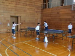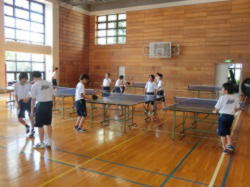 挌技室では、部活動支援員の方に指導を受けながら、卓球部が練習に臨みます。風の影響を受けるので、休憩時以外は大型扇風機が使用できませんが、体調管理に気を付けながら練習に臨みます。