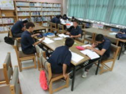 図書室で自己の課題に取り組む自学自習教室に参加する生徒たちです。持ち寄った課題は様々ですが、各自の計画に沿って取り組みます。自ら考えながら物事にのぞむ姿勢は大切です。