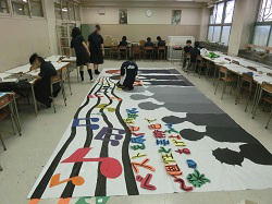 本日、世田谷区民会館で行われている世田谷区立中学校音楽発表会に、吹奏楽部は午後の部で演奏を行います。午前中、本番に向けて最後の練習に取り組む様子です。美術室では、美術部が合同作品の完成に向けて協力して取り組みます。