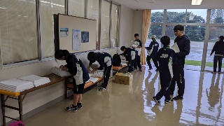 副室長がシーツ、枕カバーを数えて部屋に運びます。手際よく役割を果たします。これから食事までの間、クラスごとに入浴です。