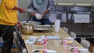 食事係は、朝会が終わってすぐに朝食の準備です。進んで役割を果たし、手際よく準備を終えました。おかげで、予定より早く生徒たちが食堂に集まります。