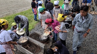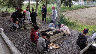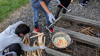 かまどに火が入り、飯盒炊さんの雰囲気いっぱいです。かまど係は、火力に気をつけて気が抜けません。出来上がりが楽しみです。