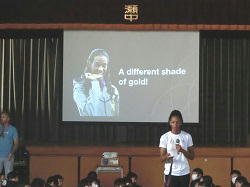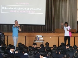 全校生徒を対象に、ゴールドメダリストによる授業を行いました。この取組はEFエデュケーション・ファーストのご協力により実現しました。授業は、USA元オリンピック代表選手で、金メダリストのDeeDee TrotterさんとEFアカデミックディレクターのKris Kullengrenさんの進行で行われました。オリンピックの3つの価値であるExcellence(卓越性)、Respect(尊敬)、Friendship(友情)について、DeeDeeさんの経験に基づいたお話を伺うとともに、互いに尊敬できることを伝えたり、あいさつの仕方を表現したりする活動を行いました。夢を実現するための参考となるお話を伺うことができました。