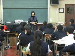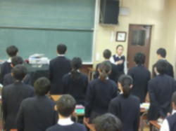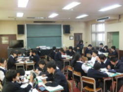 1年音楽の様子です。始めは、毎回の授業で生徒たちが順番に指揮者を務めて歌う、校歌の歌声が教室に響き渡りました。詩の内容と曲想とのかかわりを感じ取る授業では、シューベルトの「魔王」とレーヴェルの「魔王」を聴き比べ、作曲者による表現の違いや共通点などについてグループで意見交換を活発に行いました。身振りを付けたり、歌を交えたりするなど、表現豊かに説明する生徒たちの姿がありました。
