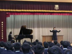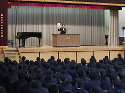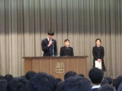 第2学期終業式では、各学年代表生徒から2学期の振り返りと次学期に向けての抱負が発表されました。来学期は、次年度に向けての準備の学期です。さらなる成長を期待します。また、世田谷子ども駅伝大会、東京都中学校新聞スクラップコンクール、美化コンクールの表彰を行い、活動の成果を称えました。これまで、校歌の指揮、伴奏を担ってくれた3年生は、2学期終業式が最後の担当になります。1年間ありがとうございました。生活指導担当から冬休みに向けての確認が行われました。冬休みを計画的に過ごし、第3学期始業式での元気な姿を楽しみにしています。