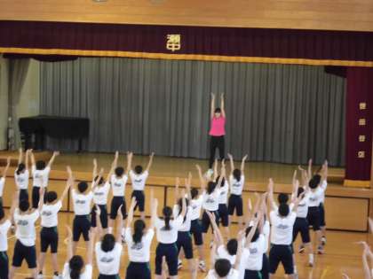 本校は毎年ラジオ体操の専門の先生をお招きして「ラジオ体操教室」を行っています。(左の写真は昨年度のもの)