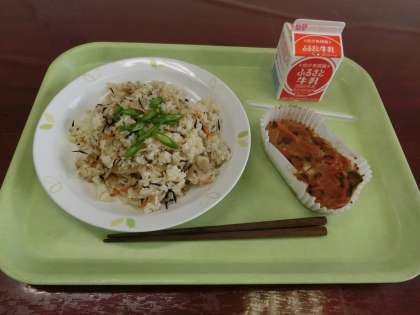 午前の授業が終わったら、待ちに待った給食です。感染防止のため、配膳は先生が行います。担任の先生と副担の先生、支援員の先生など総動員です。それでも人手が足りないため、給食当番の2名に牛乳配りとトレイ出しのお手伝いをお願いしました。(今年度から牛乳は紙パックとなりました。)