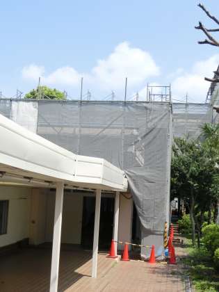 すでにお知らせしておりますが、7月から音楽室棟の校舎外壁改修・屋上防水の工事と体育館耐震補強工事が始まっています。