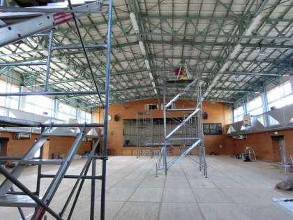 体育館耐震補強工事は、当初昨年度に行われる予定でしたが、諸般の事情により今年度となりました。右の写真は現在の体育館の内部の様子です。暑い中、工事業者の方々や職人さんが、懸命に作業を進めています。補強されて安心感が増した体育館での活動が待ち遠しいです。