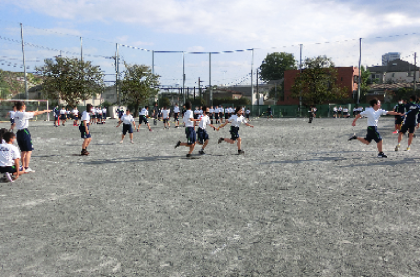 大縄跳びは、クラス2チームに分かれ、1回に跳ぶ人数を減らして実施します。