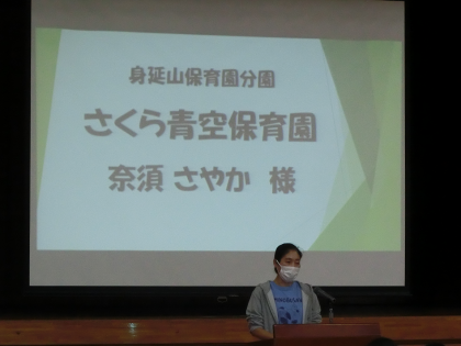 ふたりめは、瀬田中のおとなり「身延山保育園分園 さくら青空保育園」の保育士 奈須さやか様です。保育園の時にお世話になった人もいました。園児にとって保護者の次に安心してもらえる存在になるために、丁寧に保育をすることや段階的に教育していくこと、そして安心安全な環境を保つために、栄養士、調理師、看護師の存在はとても大事だというお話が印象に残りました。