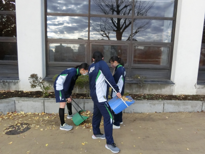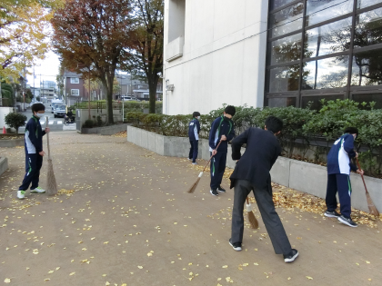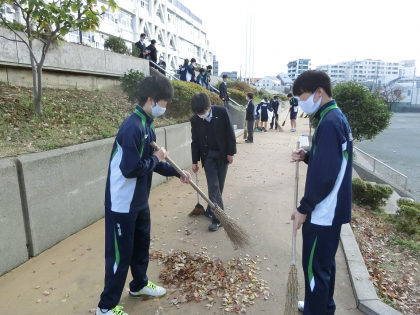 今日から美化委員会が呼びかけている「落ち葉掃きボランティア」が始まりました。学年ごとに2日間行います。今日は2年生のみなさんが早めに登校し、落ち葉を集めました。