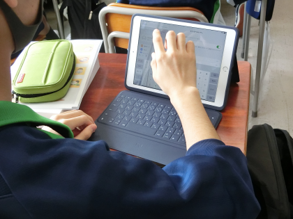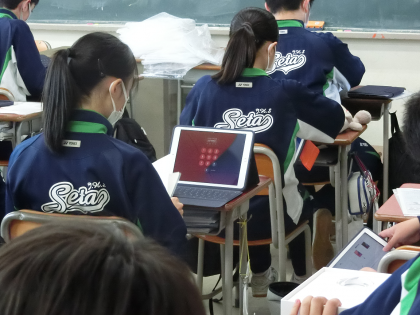 世田谷区教育委員会が推進する「せたがや11+」の取組として、ICTを活用した学習が本格始動します。探求的な学びを通して、自ら考え、表現することのできる生徒を育成するためのツールとしてまずは3年生に学習用タブレット端末(iPad)が配備されました。